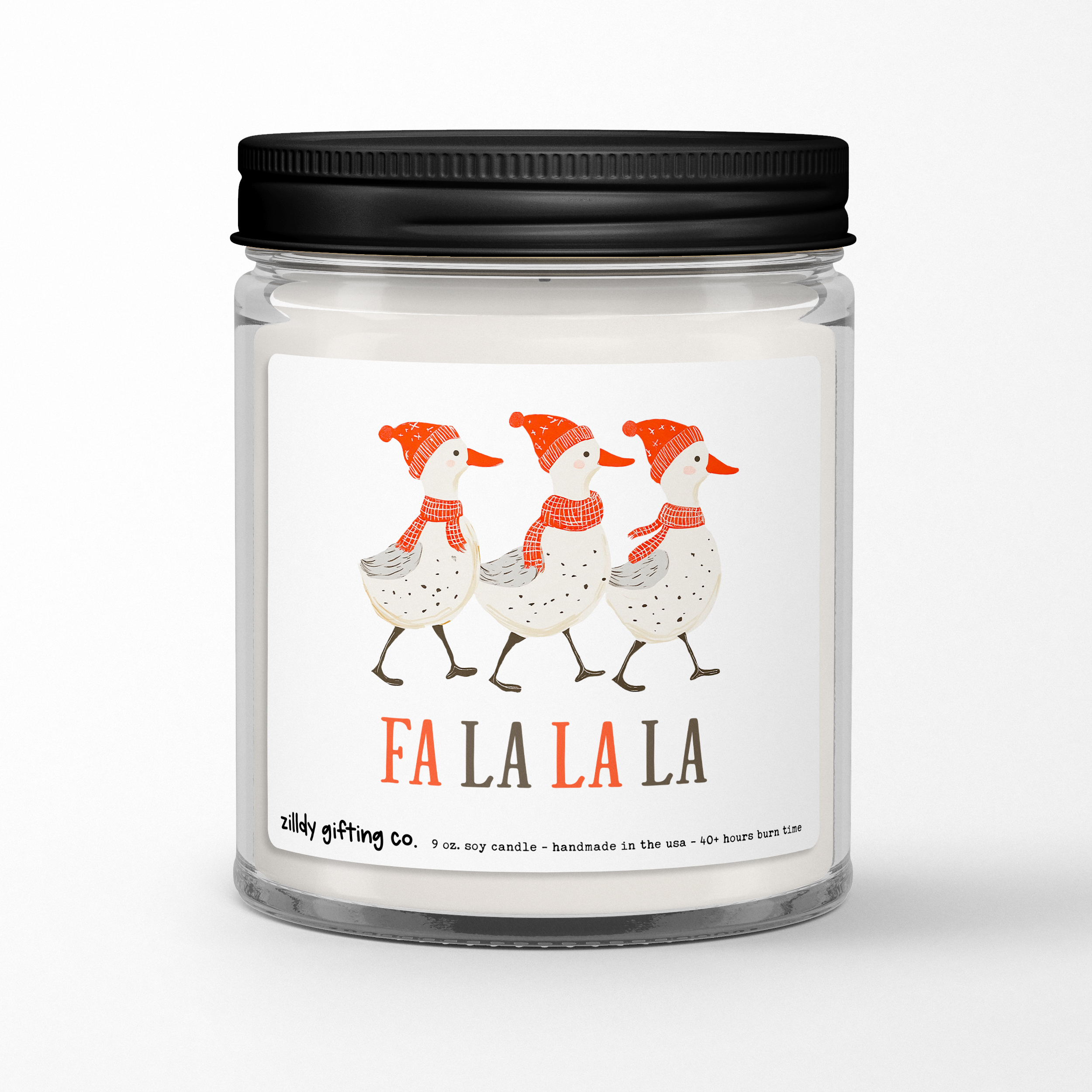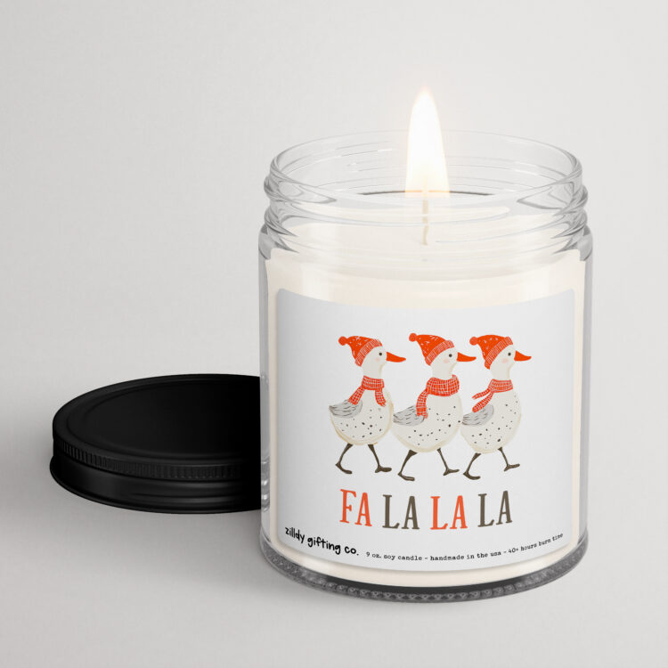Embrace the joy of the holiday season with our delightful Handmade Scented Soy Candle, featuring three charming ducks in festive hats and scarves along with the cheerful phrase “Fa La La La.” This whimsical candle is perfect for spreading holiday cheer in your home or as a delightful gift for family and friends.