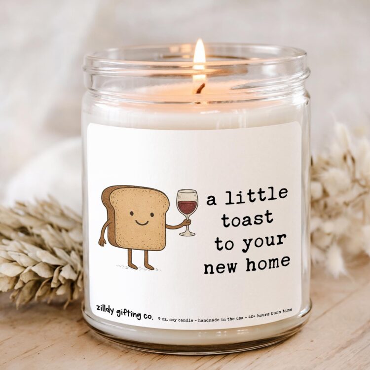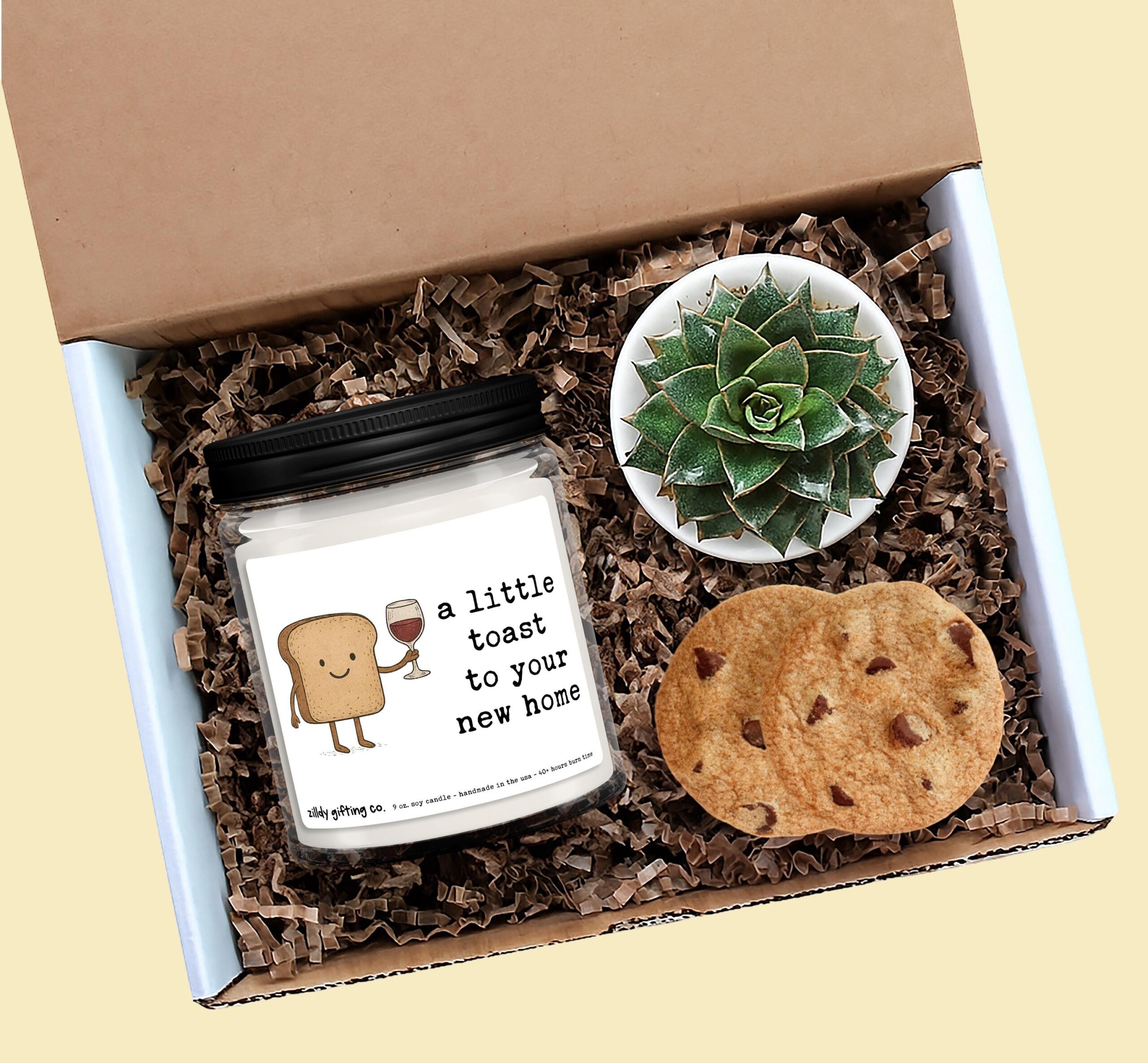 Celebrate a fresh start with this adorable “A Little Toast to Your New Home” gift box! This 9-ounce handmade soy candle is topped with cozy charm and a touch of humor, featuring a smiling toast holding a glass of wine. Each candle burns cleanly for 40+ hours, filling their home with warmth and comfort. The gift box also includes a live succulent and gourmet chocolate chip cookies for a sweet housewarming treat. You can even add a bath bomb or sugar scrub for an extra pampering touch. Thoughtfully packaged and ready to gift, it’s the perfect way to say “welcome home” with style and laughter.