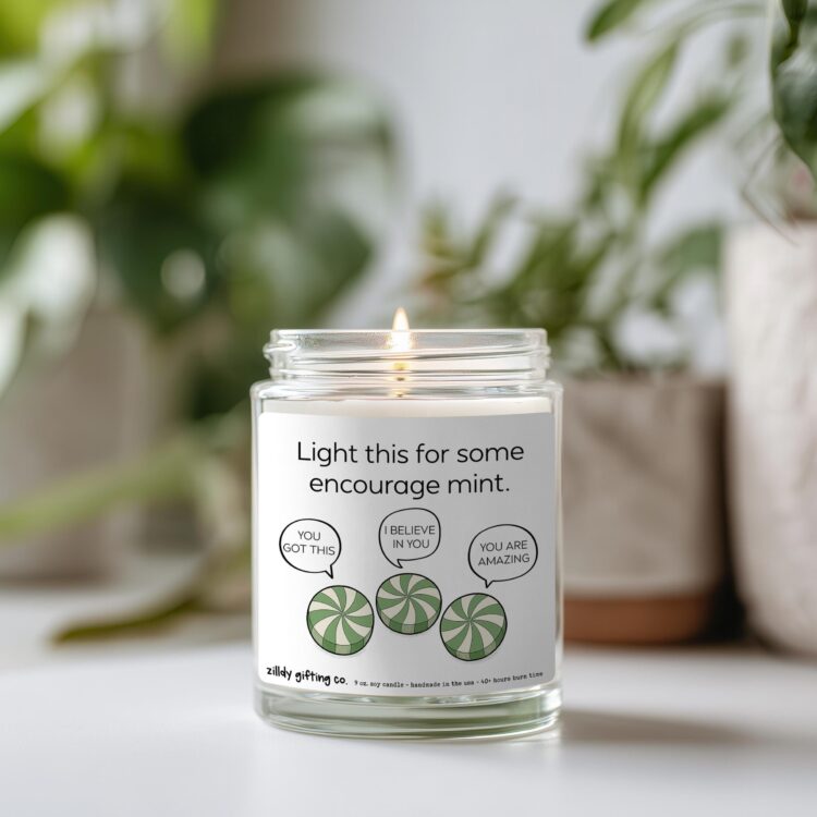 Inside, they’ll find a 9oz handmade soy candle (burn time 40+ hours) with a playful mint design and affirming messages, a lush live succulent in a 2.5″ pot, and some Tate’s Bake Shop cookies.