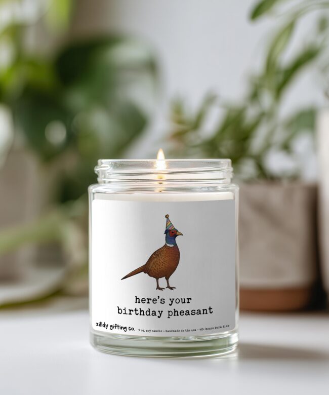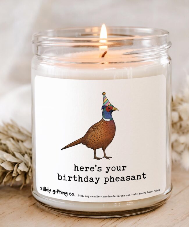Funny Birthday Candle Gift Box – “Here’s Your Birthday Pheasant” – Personalized Soy Candle with Succulent & Cookies – Handmade Gift