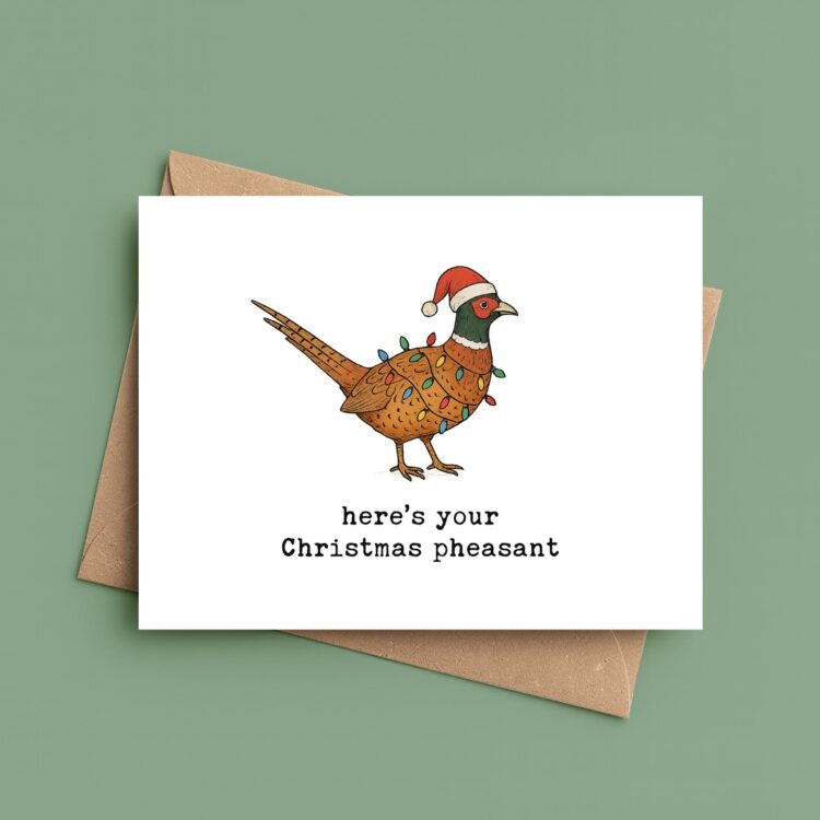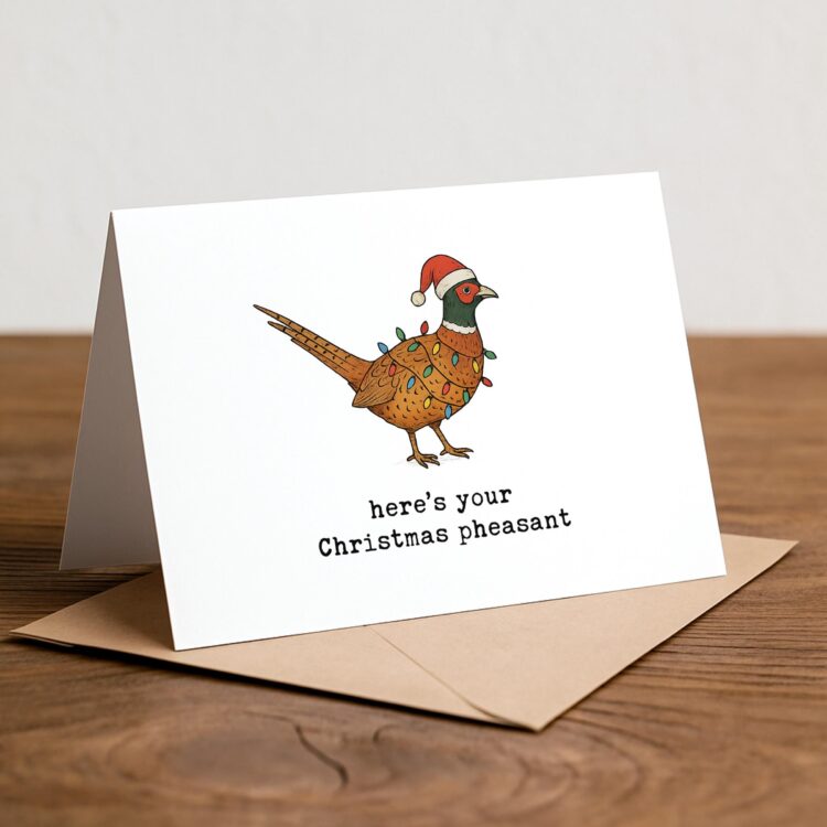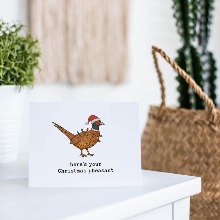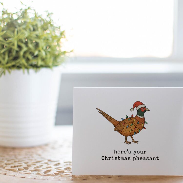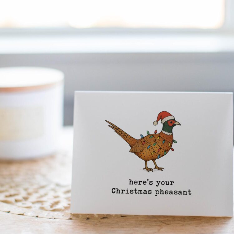 Celebrate the cozy season with a touch of festive humor through this charming greeting card. Designed for animal lovers and pun enthusiasts alike, it features a delightful pheasant decked out in Christmas lights and a Santa hat, sure to bring merry laughs to anyone who receives it. Handmade with care, this funny holiday card captures the joyful spirit of the season in a uniquely punny way.