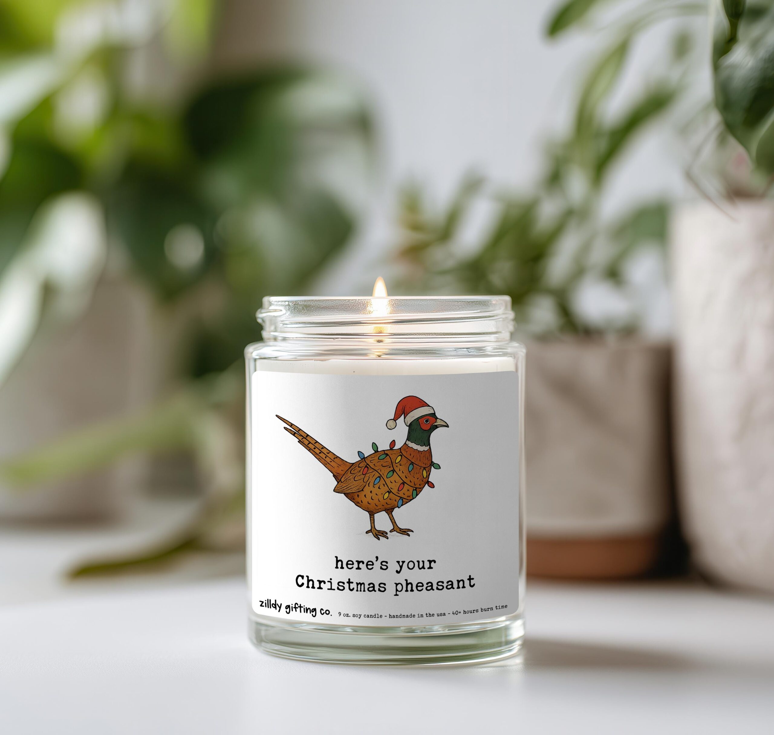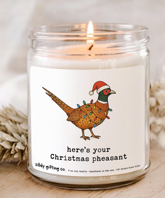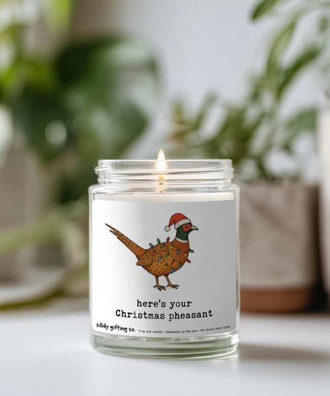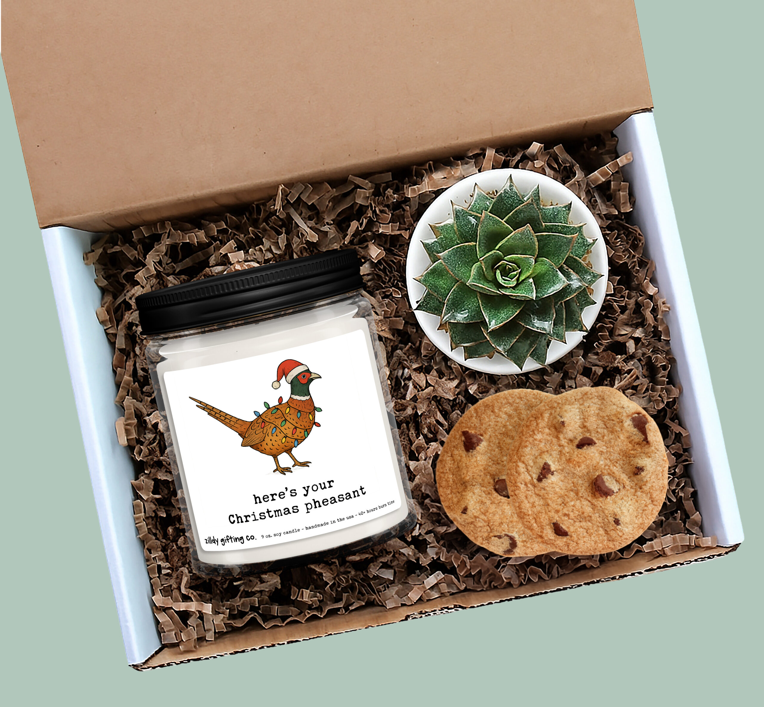 Give the gift of laughter, warmth, and Christmas cheer with our “Here’s Your Christmas Pheasant” Soy Candle Gift Box. This handmade holiday gift includes a 9oz festive soy candle with a hand-illustrated pheasant donning Christmas lights and a Santa hat, a beautiful live succulent in a 2.5″ pot, and some irresistible Tate’s Bake Shop chocolate chip cookies.