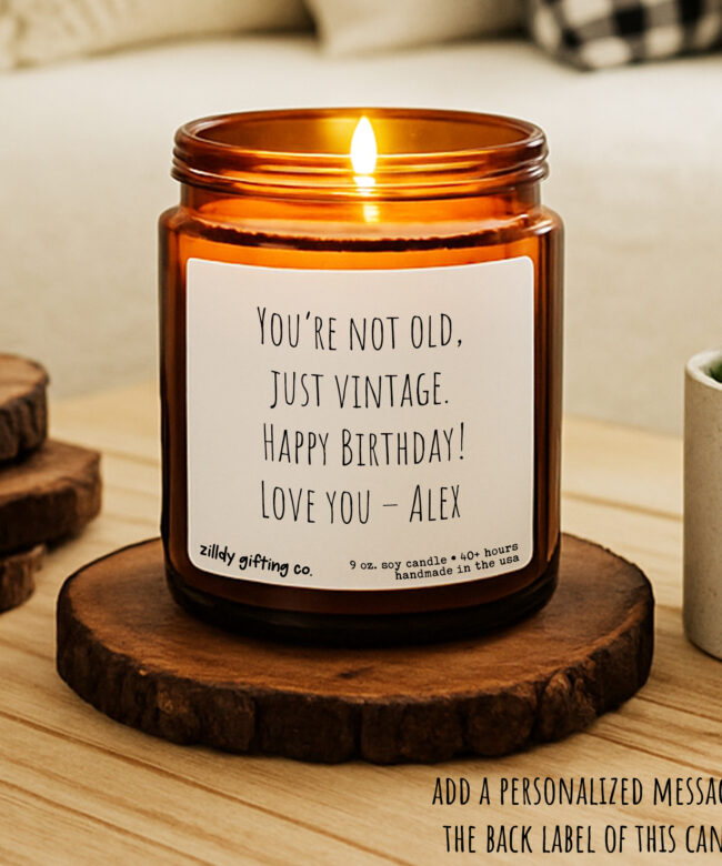 Celebrate getting older with a laugh! This handmade soy candle features the hilarious message: “It’s weird being the same age as old people. Happy Birthday!” Whether you’re gifting it to your bestie, your sibling, or that one coworker who swears they’re not getting older — this candle brings the chuckles. Hand-poured in an amber glass jar with a burn time of up to 40 hours, it smells amazing and delivers a clean, cozy burn. A unique birthday gift that’s both heartfelt and hilarious.