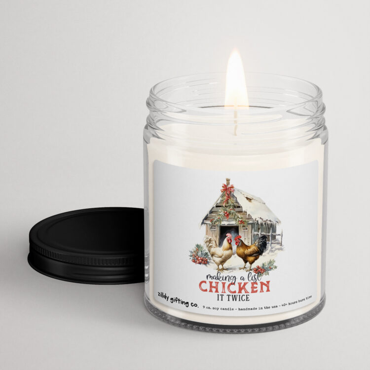 Bring a touch of humor and warmth to your holiday season with our delightful Handmade Scented Soy Candle, featuring the playful phrase “Making a List, Chicken It Twice” alongside a charming illustration of two chickens and a cozy barn adorned with festive decorations. This whimsical candle is perfect for anyone who appreciates a lighthearted twist on holiday traditions and is ideal for spreading joy during the festive season.