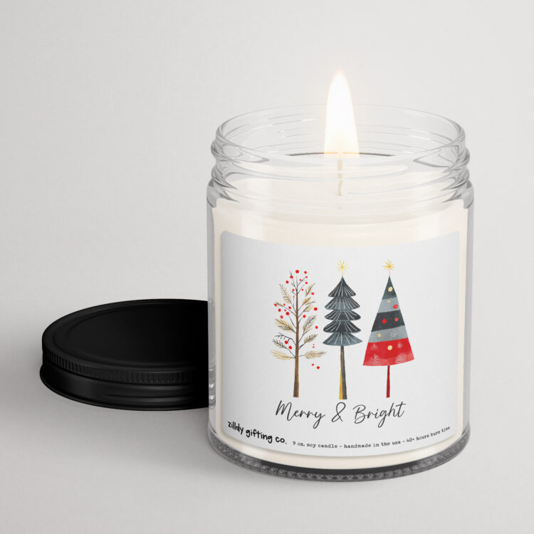 Celebrate the magic of the holiday season with our Handmade Scented Soy Candle, featuring festive Christmas trees and the joyful message “Merry & Bright” on the front label. This candle is the perfect addition to your holiday decor or a thoughtful gift to brighten someone’s Christmas. Made from 100% natural soy wax, this candle offers a clean, long-lasting burn, filling any space with a cozy fragrance.