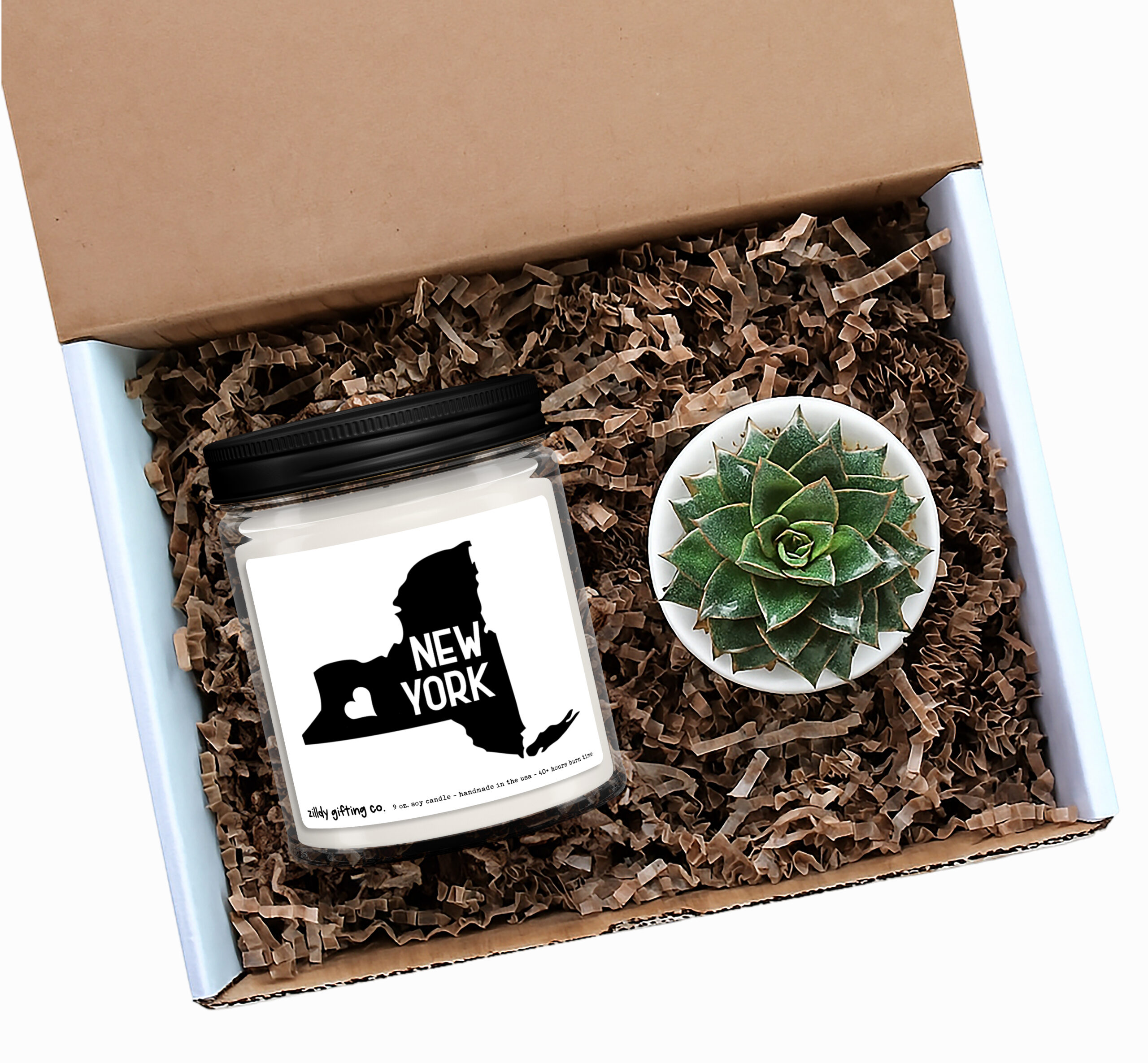 Whether they’re born and raised in the Empire State or simply left their heart in NYC, this handmade 9 oz soy candle and succulent gift is a love letter to New York. Featuring a modern black-and-white silhouette with a heart detail, this candle offers a clean 40+ hour burn and is hand-poured with care. Add a custom message to the back label to make it even more personal—perfect for birthdays, housewarmings, long-distance love, or college send-offs.