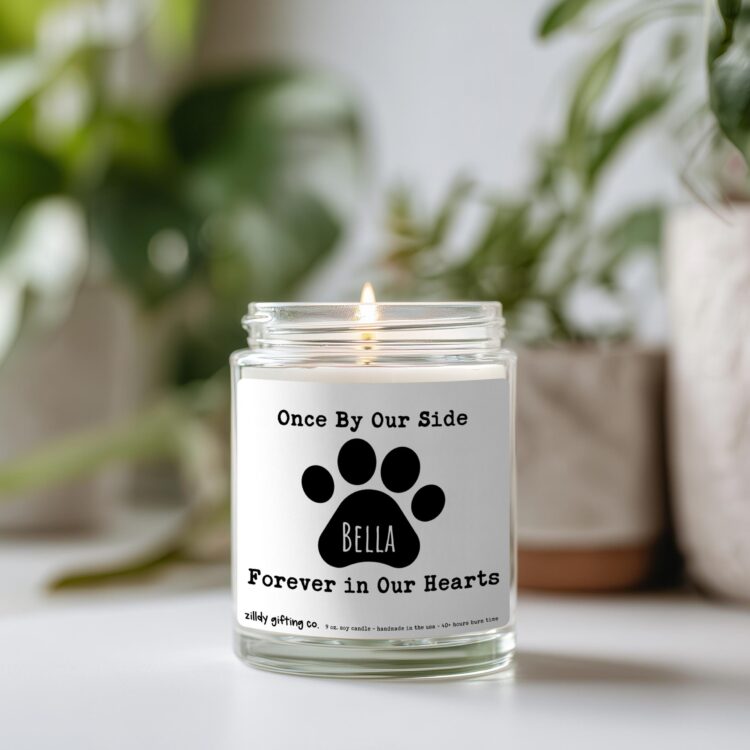 Honor the memory of a beloved pet with this personalized 9 oz soy candle featuring your pet’s name and a heartfelt paw print design. Hand-poured in the USA with a clean burn time of 40+ hours, this candle brings comfort and warmth during moments of remembrance. A thoughtful, gentle way to show someone you care during a time of loss.