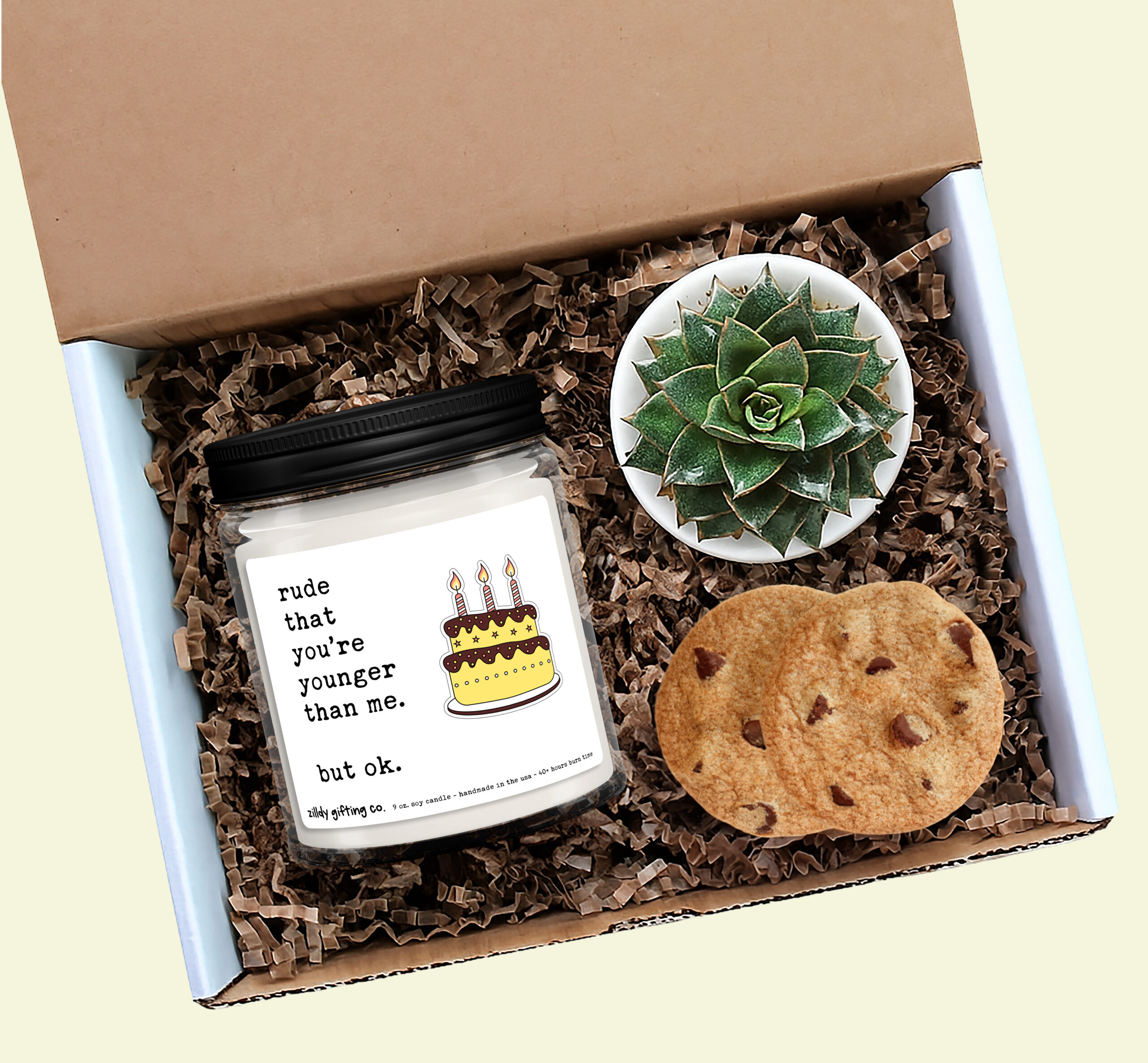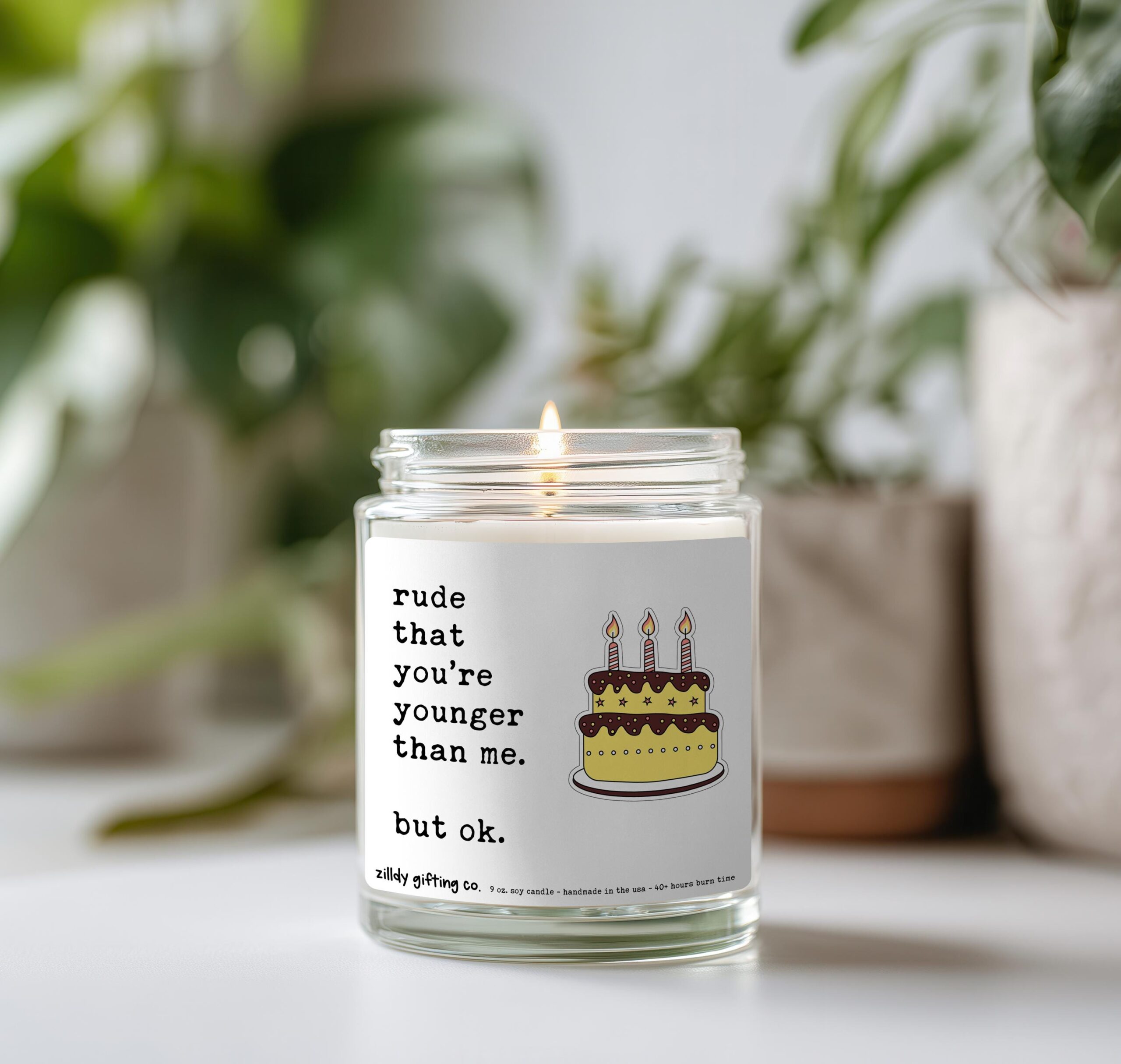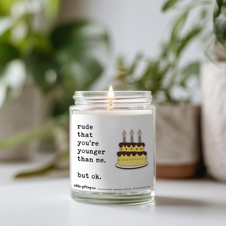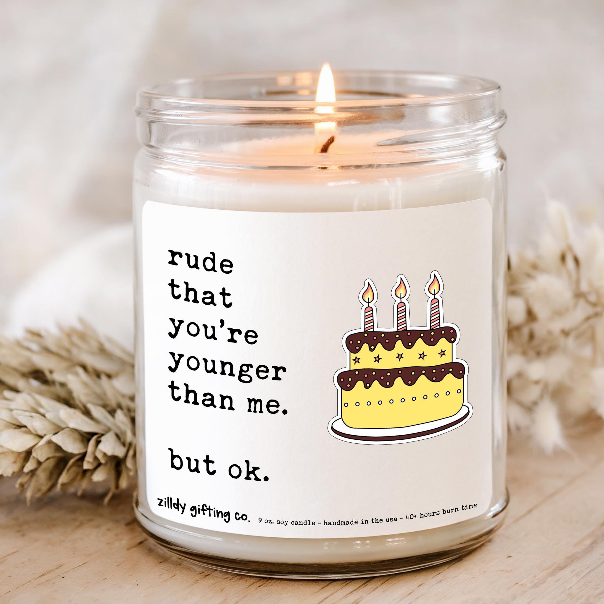 Celebrate their birthday with a good laugh (and great scent) with our “Rude That You’re Younger Than Me. But Ok.” Personalized Handmade Soy Candle Gift Box.