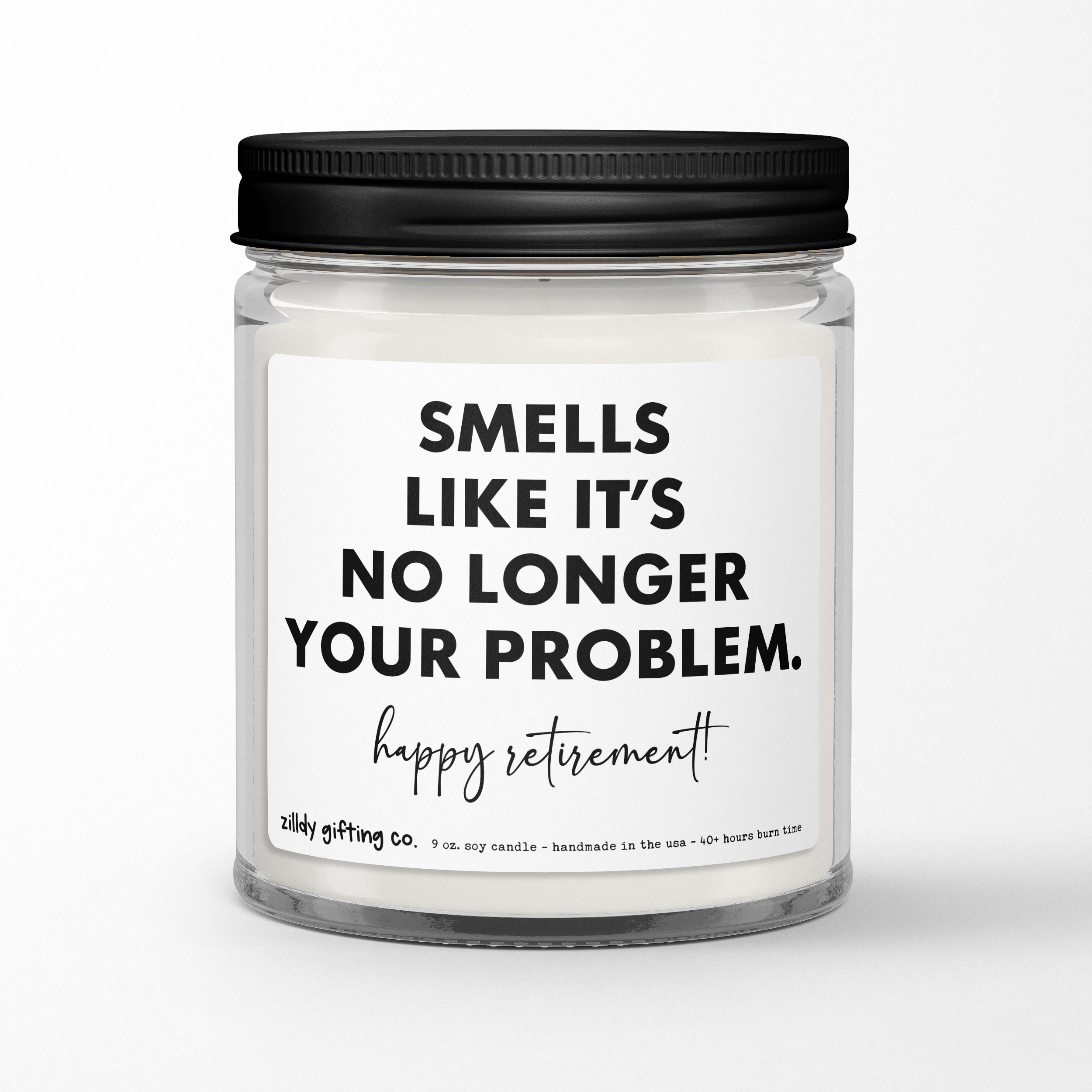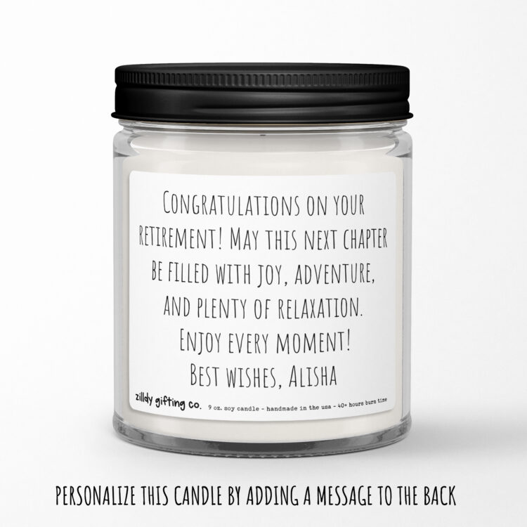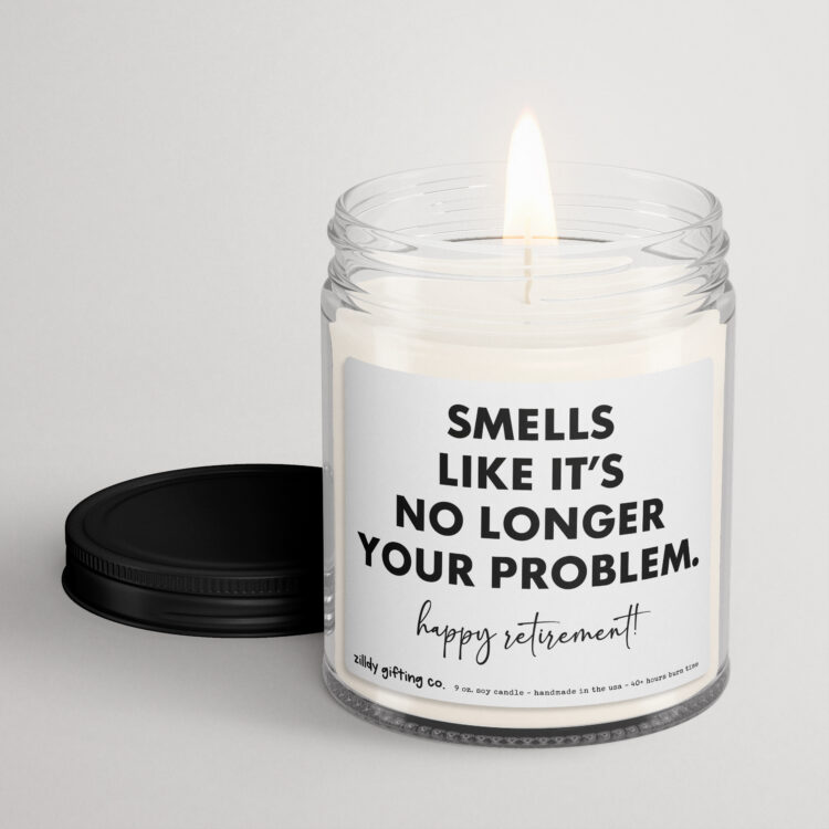 Celebrate retirement with a touch of humor using our delightful Handmade Scented Soy Candle! Adorned with the cheeky phrase “Smells like it’s no longer your problem,” this candle is the perfect gift for a coworker or friend ready to embrace their new chapter in life. Crafted from 100% natural soy wax, it provides a clean burn lasting up to 40 hours, filling their space with a warm and inviting aroma.