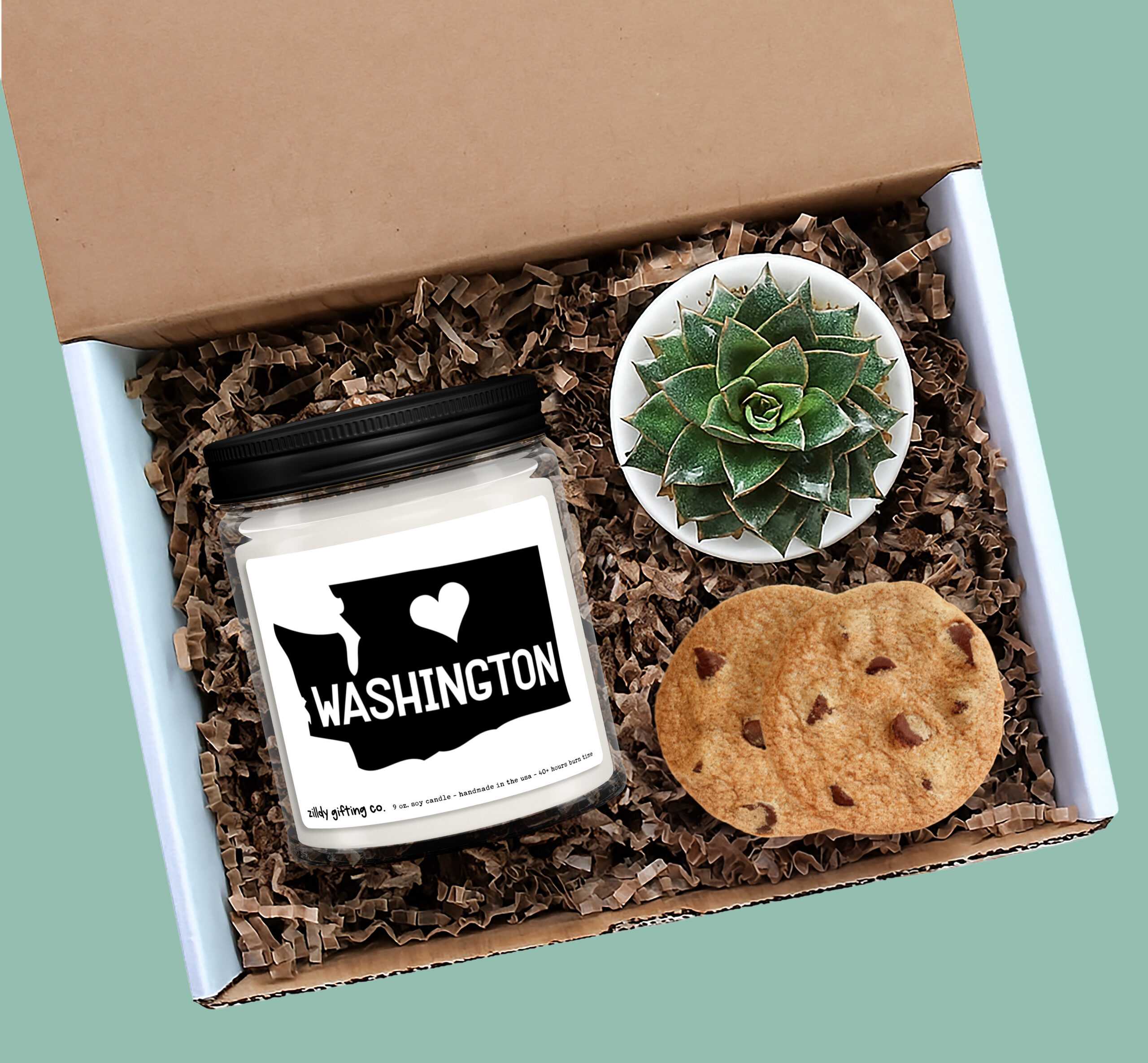 This cozy set includes a potted succulent and two gourmet chocolate chip cookies, a combination that feels like a warm hug from home. Add-on options like a bath bomb or sugar scrub make this an even more indulgent surprise. Whether it’s for someone who’s just moved away, returned home, or simply loves Washington, this candle box is the perfect way to say “thinking of you.”