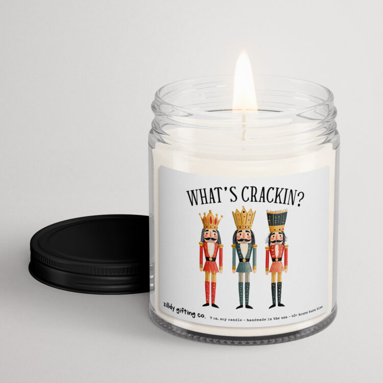 Add a touch of whimsy to your holiday celebrations with our Handmade Scented Soy Candle, featuring a delightful design of nutcracker figurines and the playful phrase “What’s Crackin’?” This charming candle is perfect for creating a festive atmosphere in your home or as a unique gift for friends and family during the holiday season.