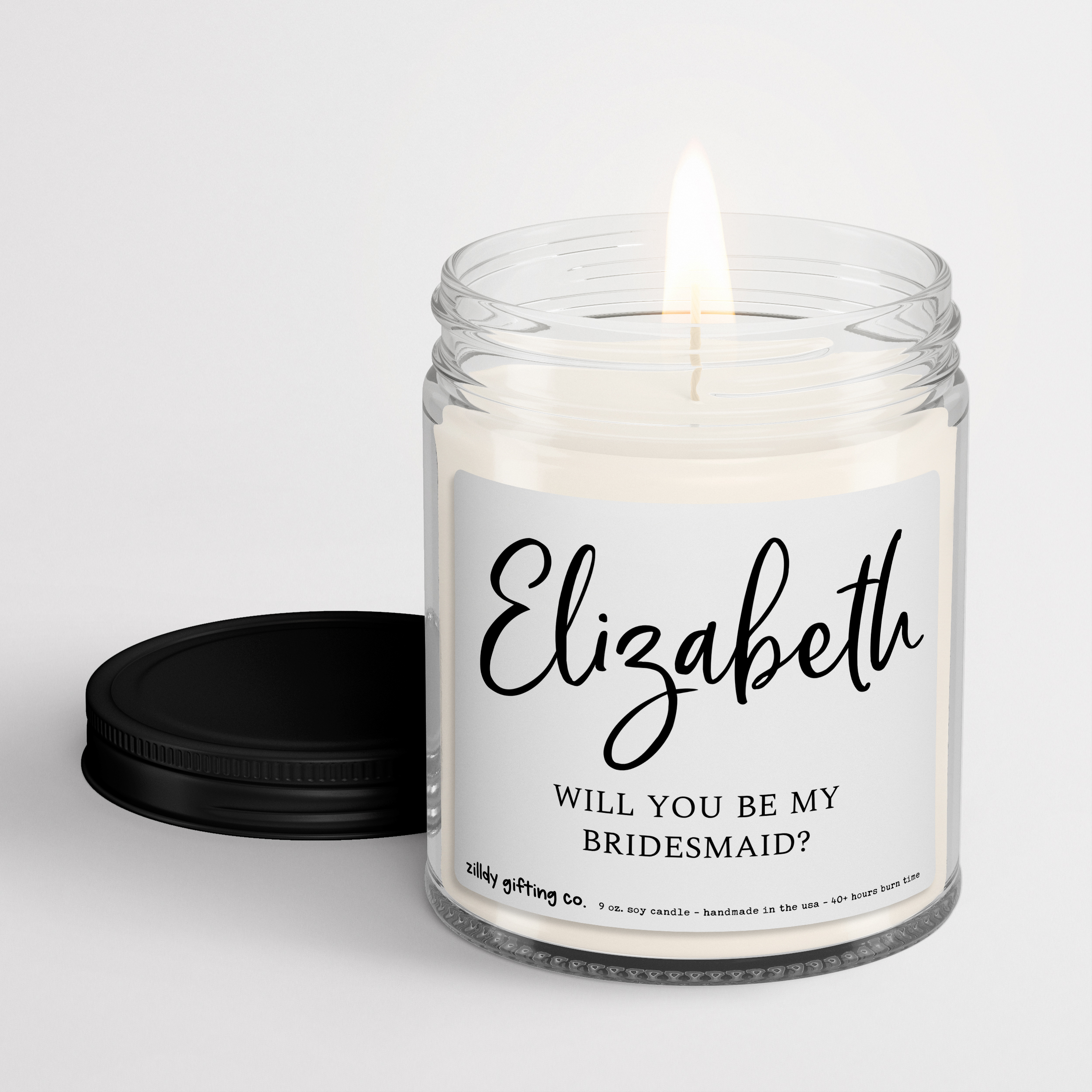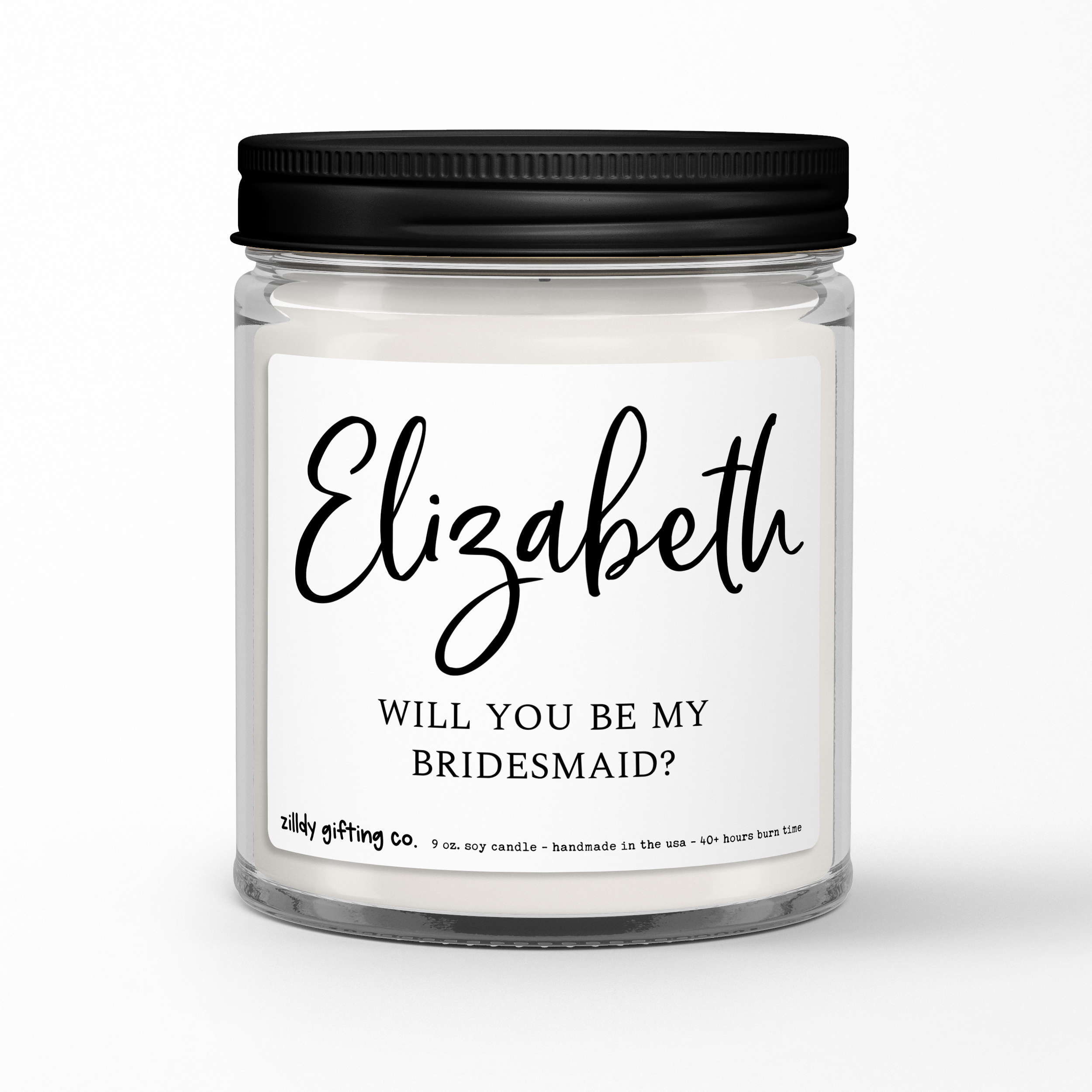 This beautifully crafted 9 oz soy candle is the perfect way to ask your closest friends to stand by your side on your big day. Personalized with the name of your choice and the heartfelt question “Will You Be My Bridesmaid?” it’s a meaningful and memorable gift that will fill the room with warmth and love. Made from high-quality soy wax, it burns for up to 40 hours, providing long-lasting enjoyment. Whether you’re asking a friend, sister, or loved one, this candle will be a keepsake they’ll cherish forever. Handmade in the USA with love and care!