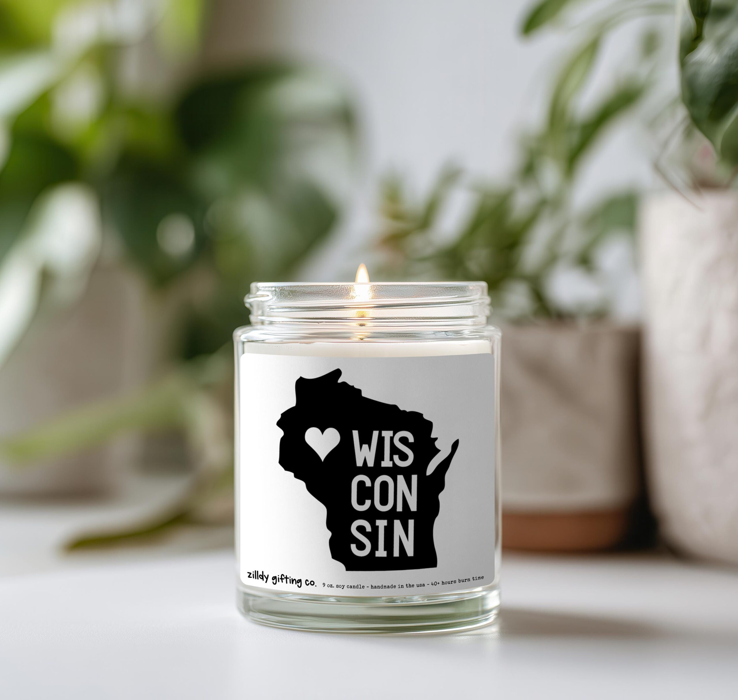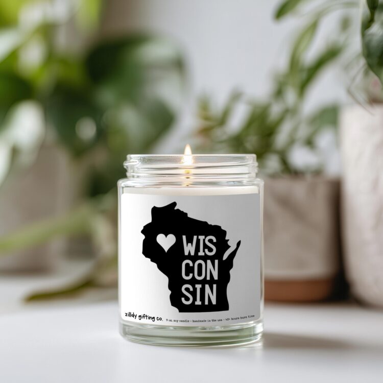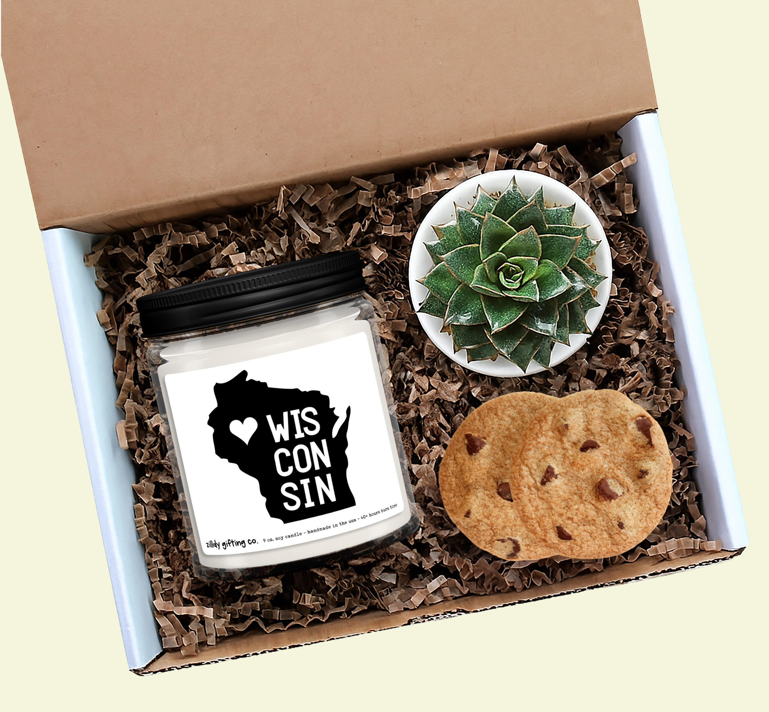 Inside each box you’ll find a 9oz soy candle (burn time 40+ hours) featuring a silhouette of Wisconsin with a heart, a live succulent in a 2.5” pot, and Tate’s Bake Shop cookies. Each candle is hand-poured in small batches for a clean, even burn and can be customized with your own special message on the back label.